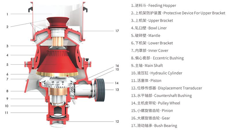 A cone crusher consists of key parts including the main shaft, mantle, bowl liner, concave, eccentric bushing, and drive mechanism.