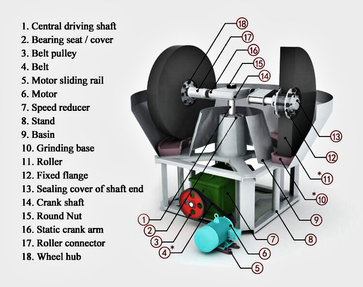 Main parts of wet pan mill are frame, basin, grinding roller, grinding base, speed reducers, motor and etc. Firstly, motor transmits power to speed reducer, then center driving shaft transmits into horizontal shaft, finally grinding roller will move counterclockwise and material will be ground into fine particle in the wet pan mill.