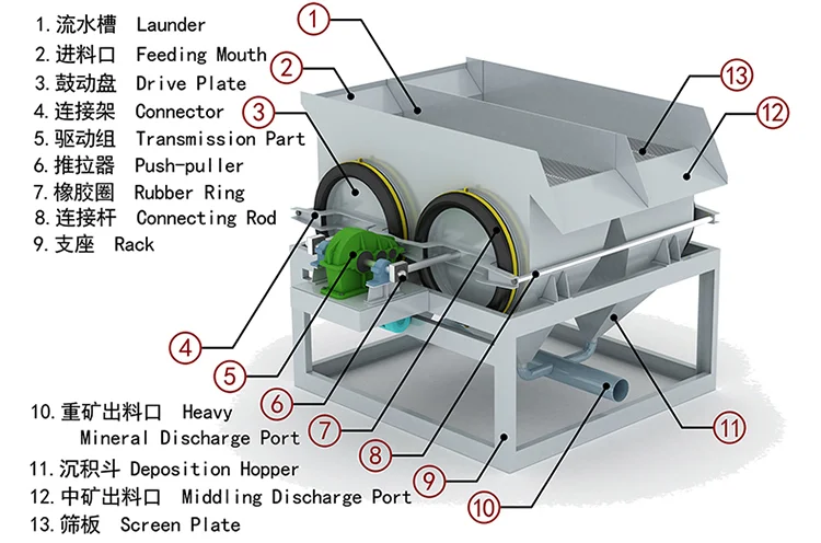 Jigging machine uses water as mineral media,belong to deep tank separation process,which can separate mineral ore from gangue according to difference of weight proportion.Diaphragm,stroke and frequency of stroke can adjust flexibly,and it is used for tungsten,tin,sand gold,hematite,magnetite,manganese,titanium,antimony,lead and niobium gravity process.