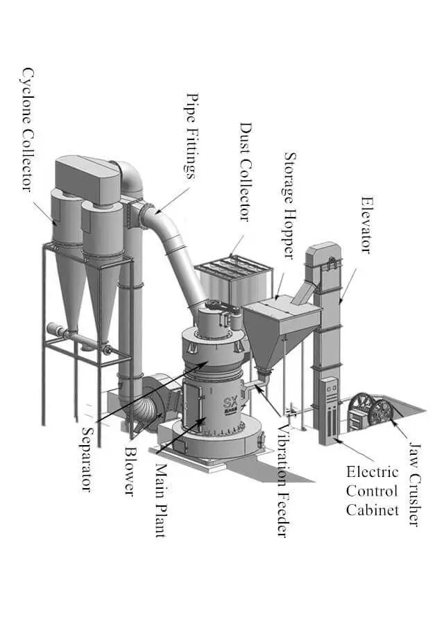 The main parts of a Raymond grinding mill plant are a cyclone collector, pipe fittings, dust collector, storage hopper, elevator, crusher, electric control cabinet, feeder, main plant, blower, separator, etc.