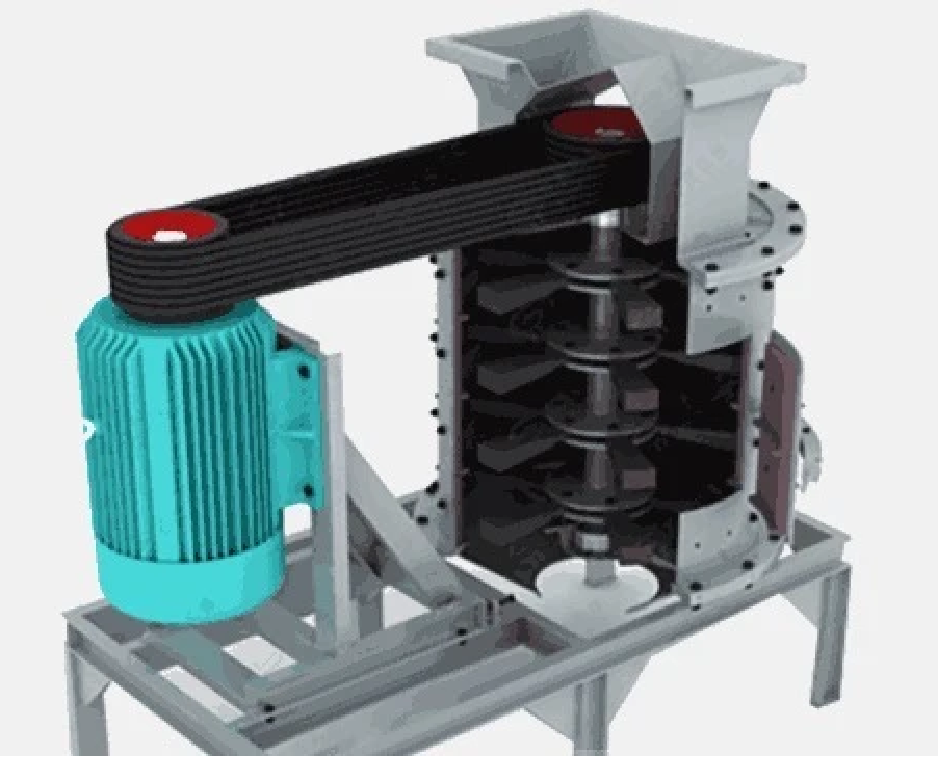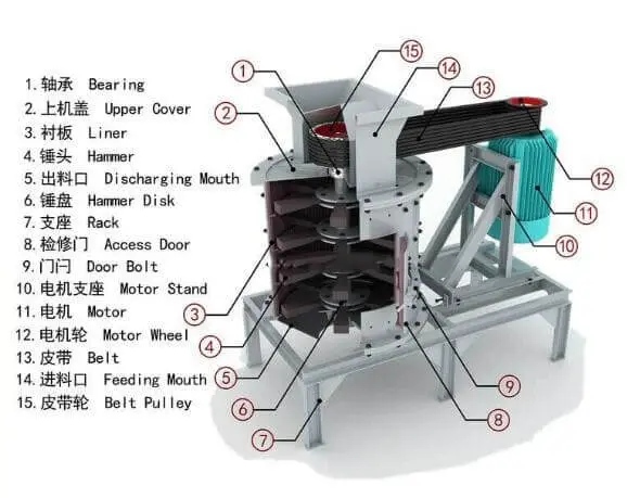 Vertical shaft compound crusher, also called vertical shaft sand-making machine, consists of a transmission device, bearing, upper machine cover, liner, hammer head, hammer plate, main shaft, belt, feed port, discharge port, support, motor, and access door, cylinder, upper cover, and base, etc., the internal structure is simple and reasonable, the operating cost is low, and the principle of stone against stone is used to reduce wear and tear.