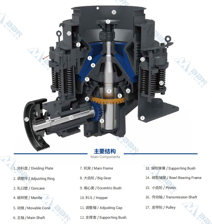 Spring Cone Crusher is suitable for crushing various of mid-hard and above mid-hard ores and rocks.This crusher has advantages of reliable structure,high productivity,easy adjustment and less cost in operation.The spring r