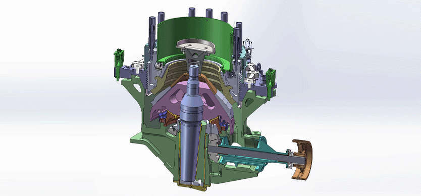 When it is working, the motor drives the eccentric bearing bushing via spring coupling, transmission shaft and a couple of cone gear wheel. The crushing cone axis is forced to swing by the eccentric bearing bushing, which makes the mantle sometimes close to the bowl liner, and some times far away from the bowl liner. The raw materials are pressed, impacted and finally crushed in the crushing chamber.
