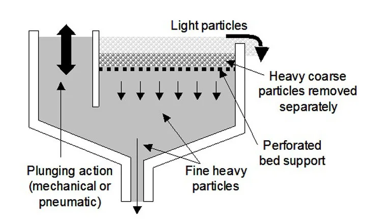 Pulsation: The machine’s drive mechanism creates a repeated upward and downward movement of water through a screen bed. This can be done with a mechanical piston, a flexible diaphragm, or pulsed air. This creates the “jigging” action.